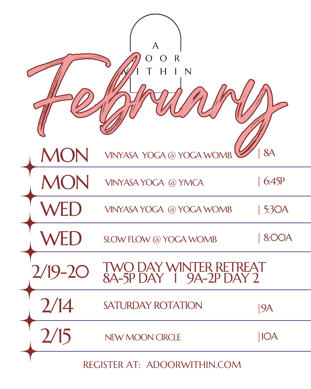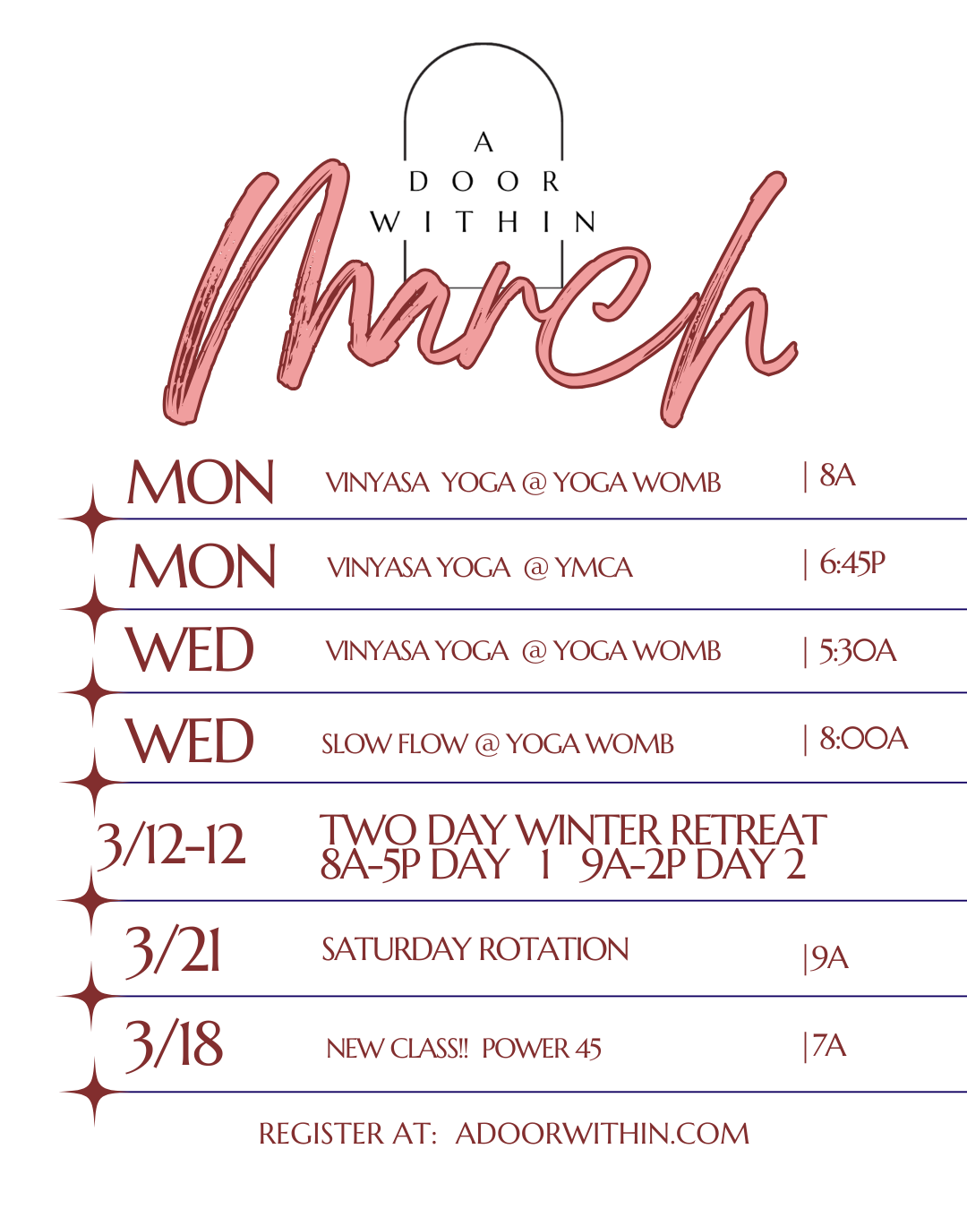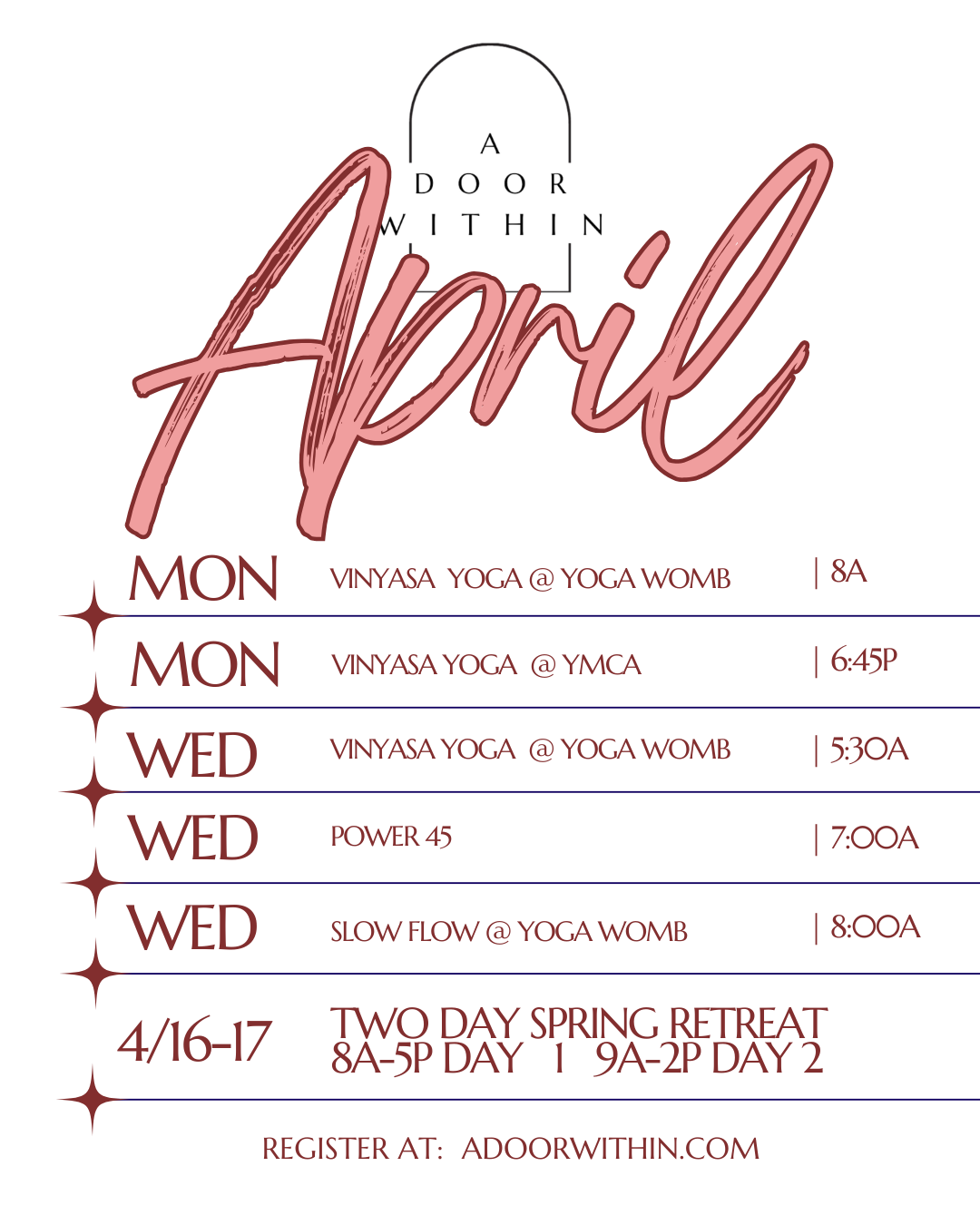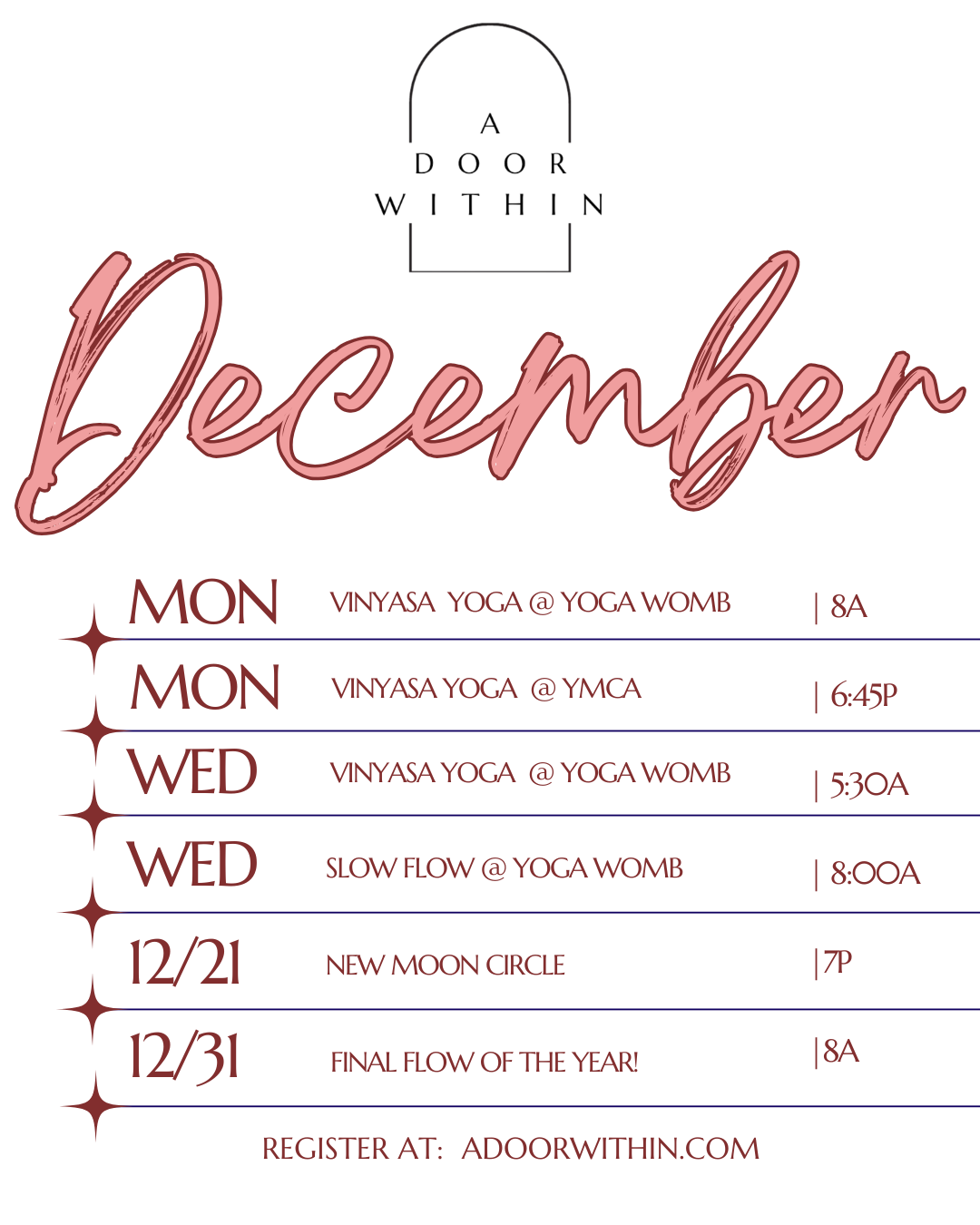 The information contained in this website is for educational purposes only and should not be taken as medical advice. Client testimonials are unique to the individual sharing them and do not guarantee similar results for others. A Door Within, LLC does not diagnose, treat or cure medical diseases but partners with you and your health care team as allied professionals to help restore balance in body, mind and spirit and enhance optimal health through yoga, bodywork and other holistic therapies.