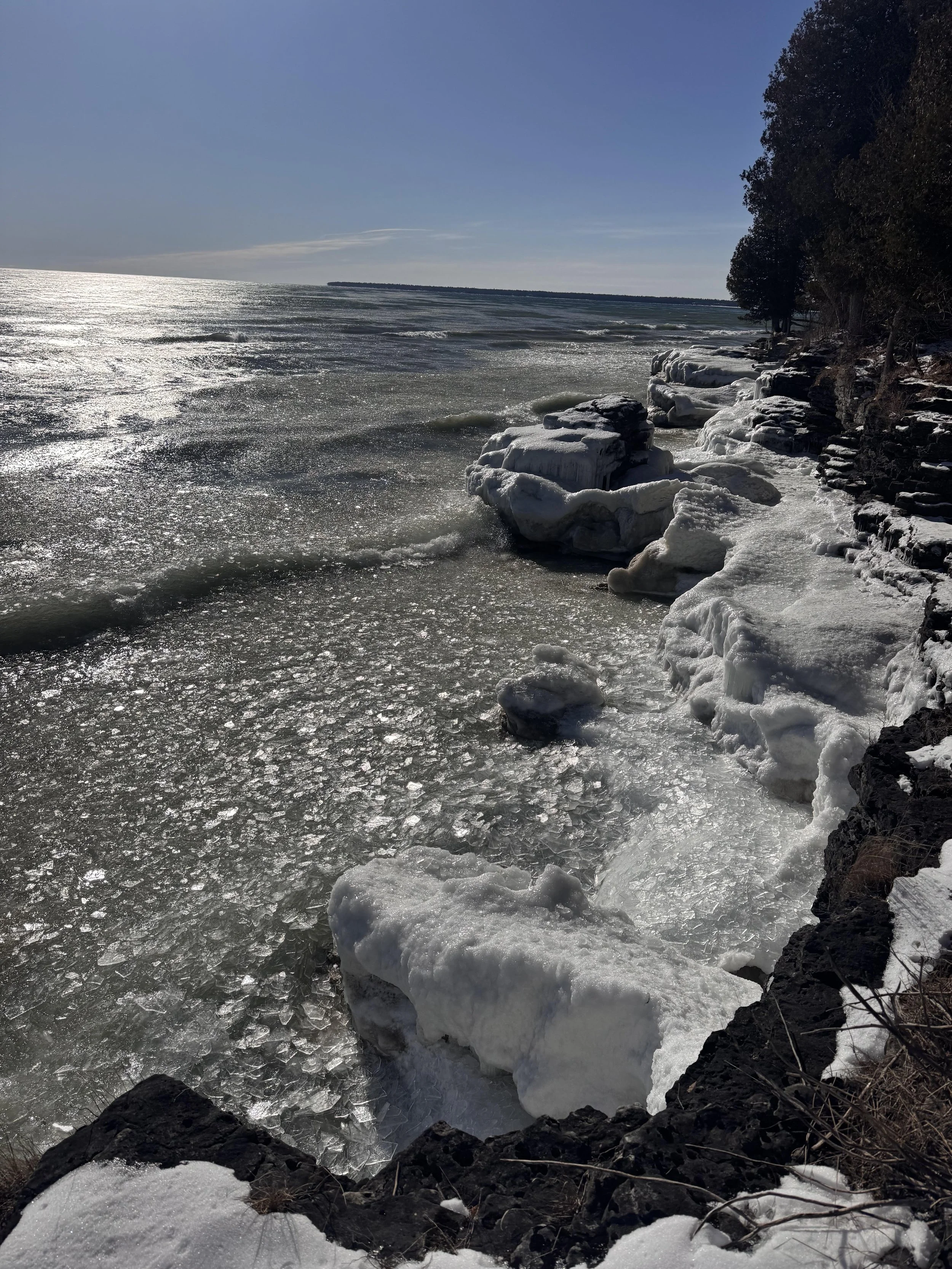 Fast forward a few hours to another spot on the lake and the waves were crashing so violently, that the large ice sheets had broken and it sounded like glass shattering. In fact, the waves were seeming to move in slow motion as they pushed piles of shattered ice onto the frozen ledge.