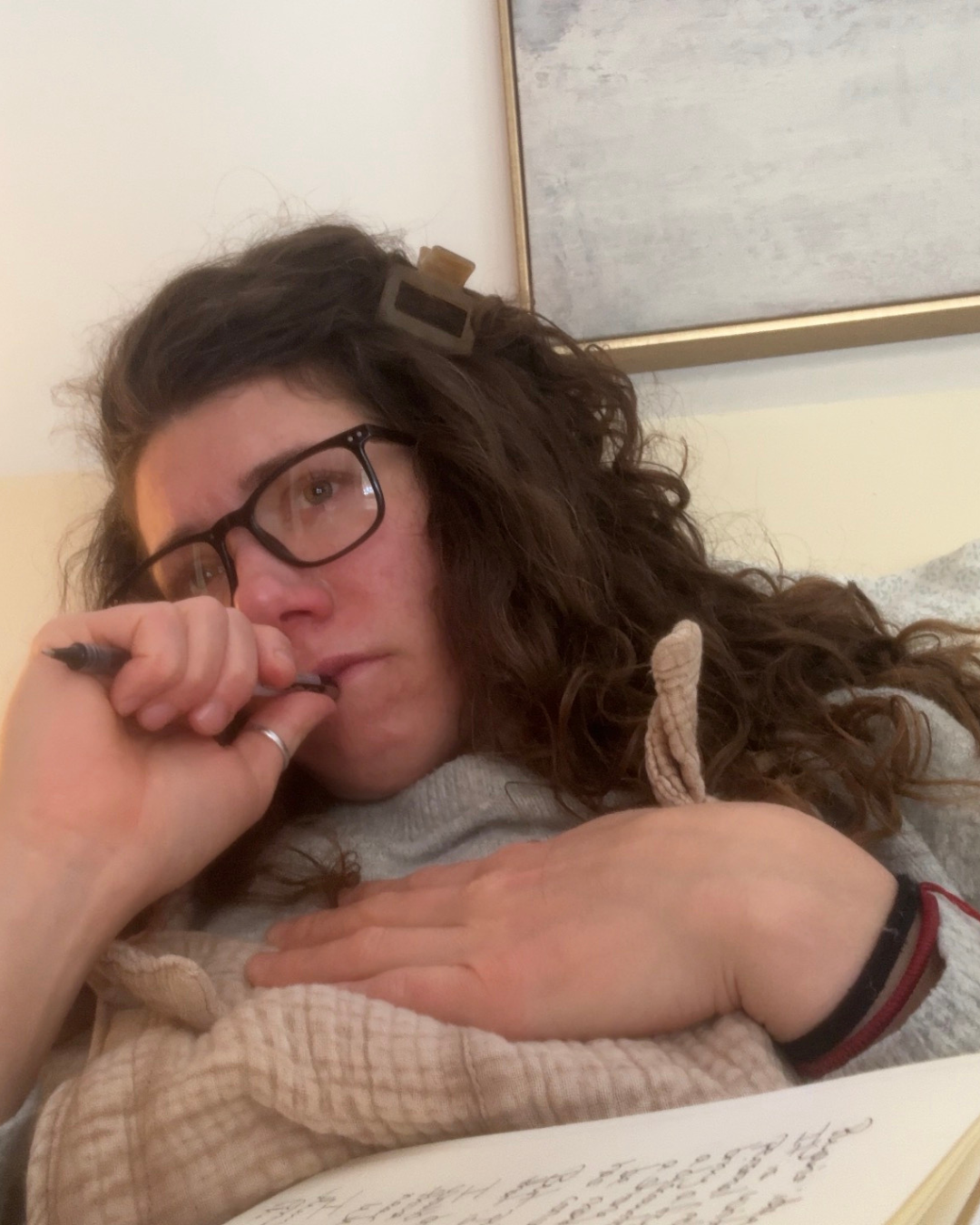 snuggling in bed writing, journaling and reading